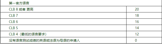 主申请人的语言能力分数是根据申请人提供的英语或法语培训证明及能力计算的。如果你既有英语语言能力,也有法语语言能力,你需要决定你对哪种语言更熟练。熟练的为你的第一官方语言,另外一种就是你的第二官方语言。申请人必须提交最近的被SINP认可的语言测试成绩作为你语言能力的判断依据。“CLB”是指加拿大语言基准。最高20分。