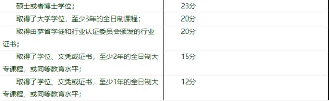 主申请人的教育程度得分是根据完成教育和受训的材料文件评定的。主申请人必须提供包括学位证书、学历证书、或教育受训相关学历证书。最高23分。
