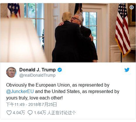 最近的一出来自欧盟与美国。几天前,美国总统特朗普在推特中发布了一张自己与欧盟委员会主席容克拥抱的照片,并称“很显然,容克代表的欧盟和我所代表的美国彼此相爱”。