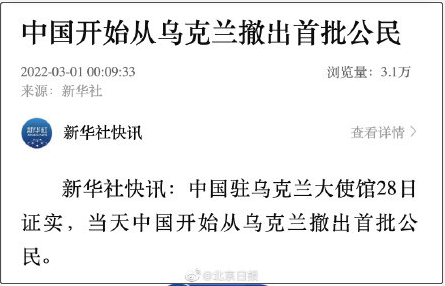 2月28日,中国驻乌克兰大使馆证实,当天中国开始从乌克兰撤出首批公民,系在敖德萨的400余名留学生,部分人现在已顺利通关至乌南部邻国摩尔多瓦。