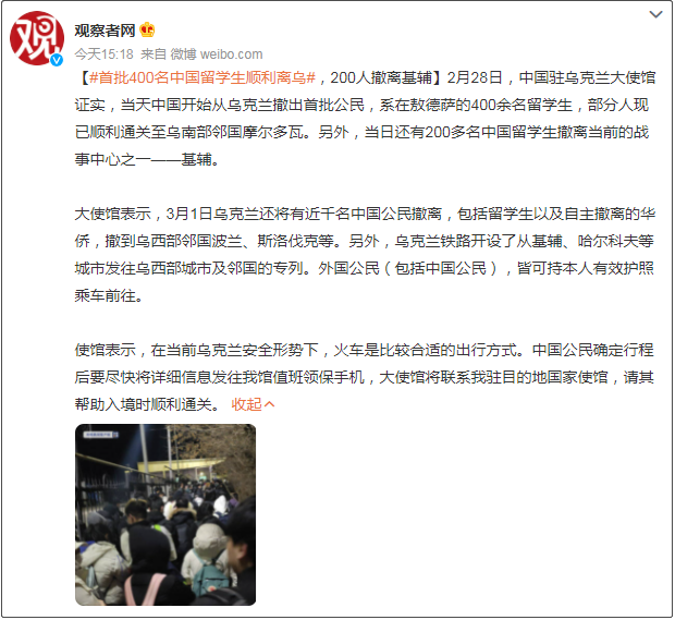 另外,当日还有200多名中国留学生撤离当前的战事中心之一——基辅。