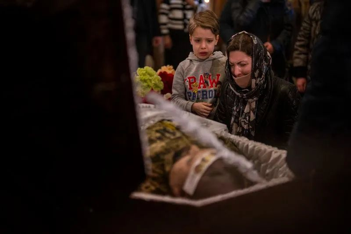 军人阵亡,留下哭泣的妻子和懵懂的孩子。